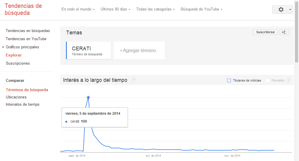 Finalmente nos preguntamos por las regiones en las que predominó la actividad en YouTube. Dado que estos datos no se identifican en nuestra base de datos, a este respecto salimos ella e indagamos en las tendencias de búsqueda en la plataforma que se produjeron durante 90 días (entre el 24 de agosto y el 24 de noviembre de 2014) en el mundo, que crecieron ante el momento de la muerte y alcanzaron su máximo el día siguiente.