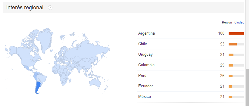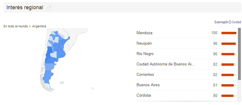 En la Argentina las regiones en que se produjeron las búsquedas son variadas y se observa mayor cantidad en algunas ciudades del interior del país que en la Ciudad de Buenos Aires. Las tendencias se ven en el siguiente gráfico: