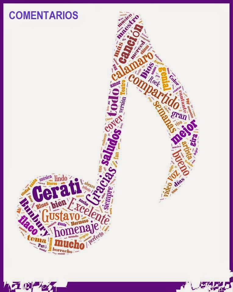 Los comentarios son una manifestación de aquellos que miran los videos y dan cuenta de las representaciones que se forman los usuarios que consumen los contenidos propuestos por otros usuarios. Aquí, además del nombre del artista, aparecen menos nombres de canciones y términos ligados a la vida y trayectoria, y más palabras valorativas en cuanto a la figura de Cerati, algunas posiblemente vinculadas a la calidad musical como “excelente” o “voz” y otras con una marcada cargadas afectiva como: “grande”, “genial”, “excelente”, “lindo” o “gracias”. Pero no se destaca la palabra “Soda”, es decir que mayoritariamente se lo recuerda más como solista que ligado a Soda Stereo. Se destacan además las palabras “compartido” que indica una relativa participación del usuario y la palabra “flaco”, quizás esta última vinculada al recuerdo de otro músico del rock ausente (Luis Alberto Espineta).